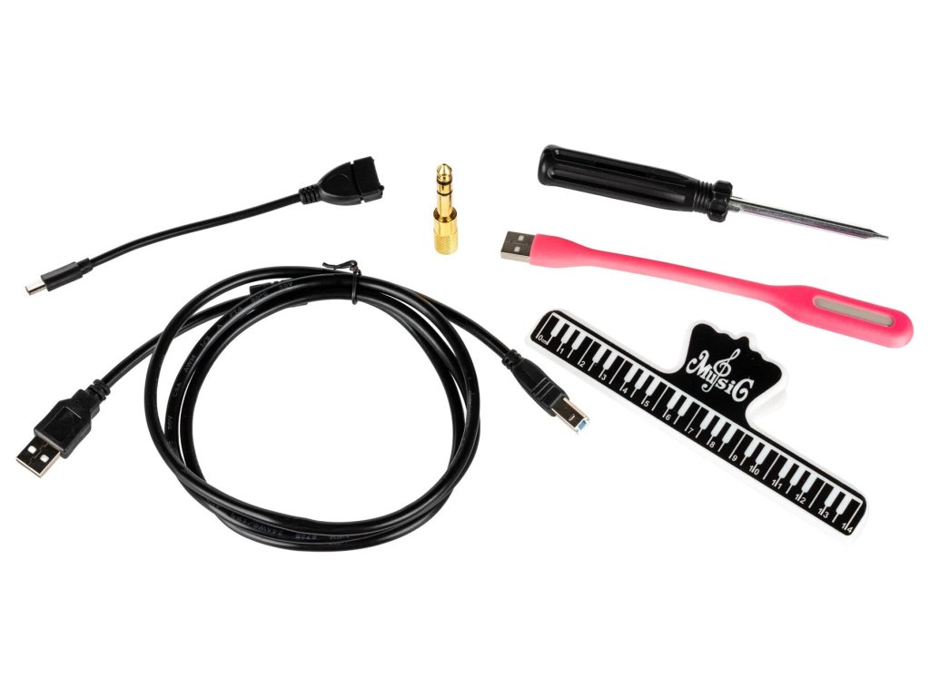 AC Adapter, Slúchadlá, Protiprachový kryt, Čistiaca handrička, USB-A to USB-B Kábel, USB Adapter, Skrutkovač, Redukcia 6,3 mm, LED Light, Note Holder Clip, Nálepky, Triple Pedal