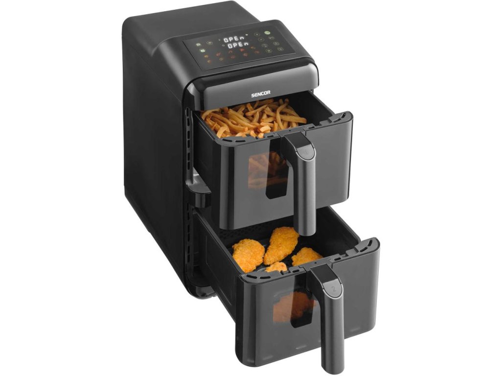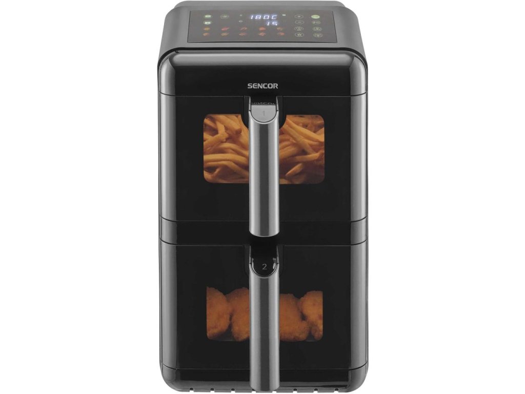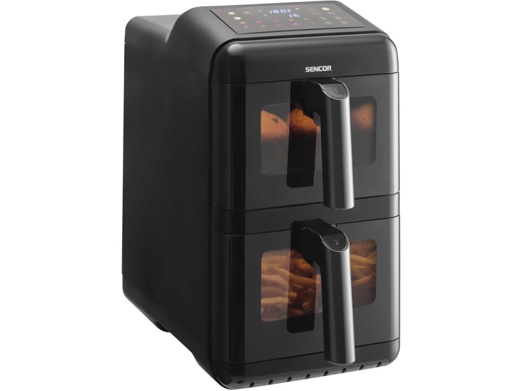 Duálna teplovzdušná fritéza Sencor SFR 1250BK prináša zdravší spôsob prípravy obľúbených jedál – frituje pomocou horúceho vzduchu bez použitia oleja, takže si vychutnáte dokonale chrumkavé hranolčeky či šťavnaté mäso bez zbytočného tuku. Vďaka duálnemu systému dokáže pripravovať dve jedlá súčasne, zatiaľ čo nepriľnavý povrch umožňuje ľahké čistenie a pohodlné varenie. Moderné technológie a elegantné čierne vyhotovenie robia z tejto fritézy nenahraditeľného kuchynského pomocníka, vďaka ktorému si užijete obľúbené chute v ľahšej a zdravšej podobe.
