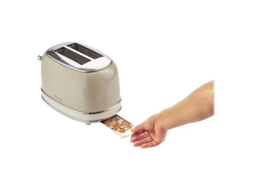 Kovový spotrebič v modernom retro dizajne vďaka výkonu 810 wattov pečivo opečie, ohreje aj rozmrazí. Pretože chute každého z nás sú rôzne, môžete pohodlne vyberať zo 6 stupňov nastavenia podľa toho, či máte radi chlieb len ľahko opečený alebo upravený do chrumkava. Naraz je možné pripravovať až 2 krajce chleba a teda behom pár minút pripraviť raňajky pre celú rodinu. Spotrebič pečivo vycentruje a automaticky vyhodí, aby ste si pri vyberaní nespálili prsty.