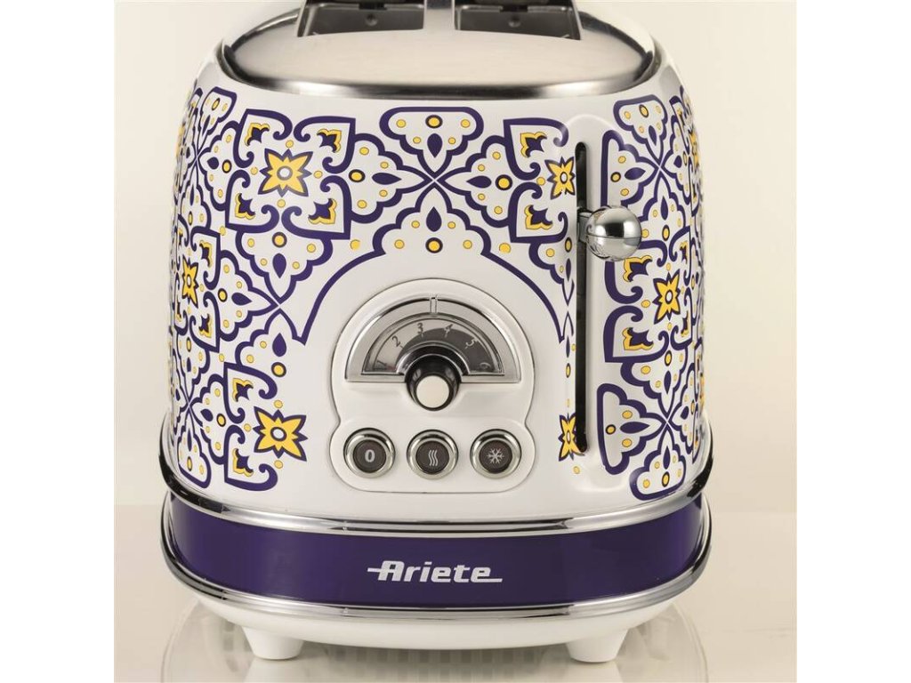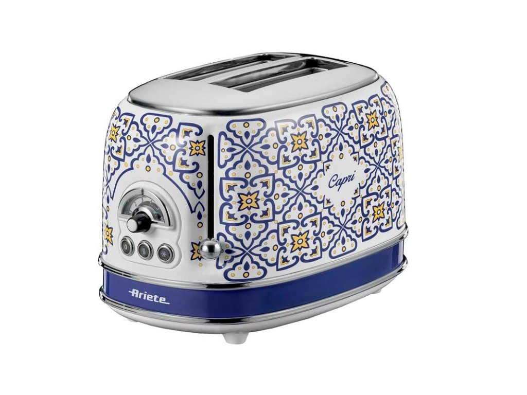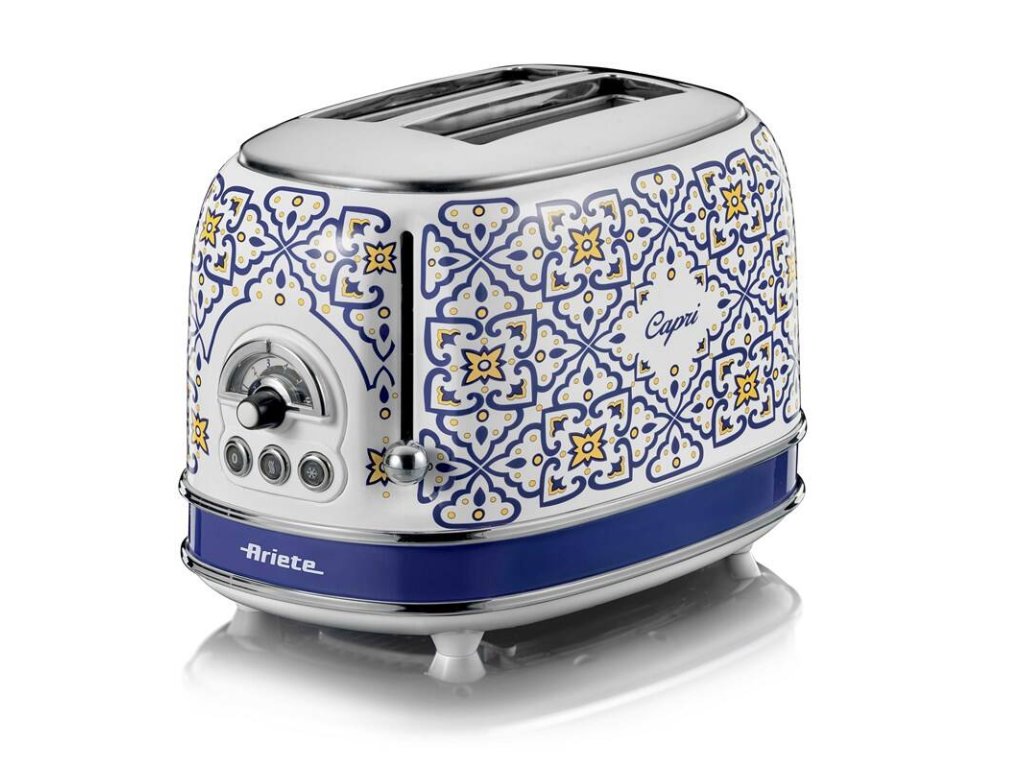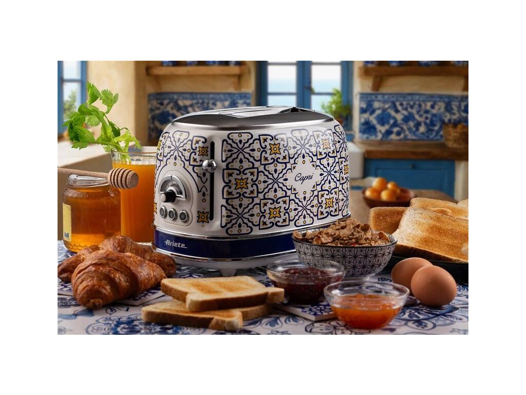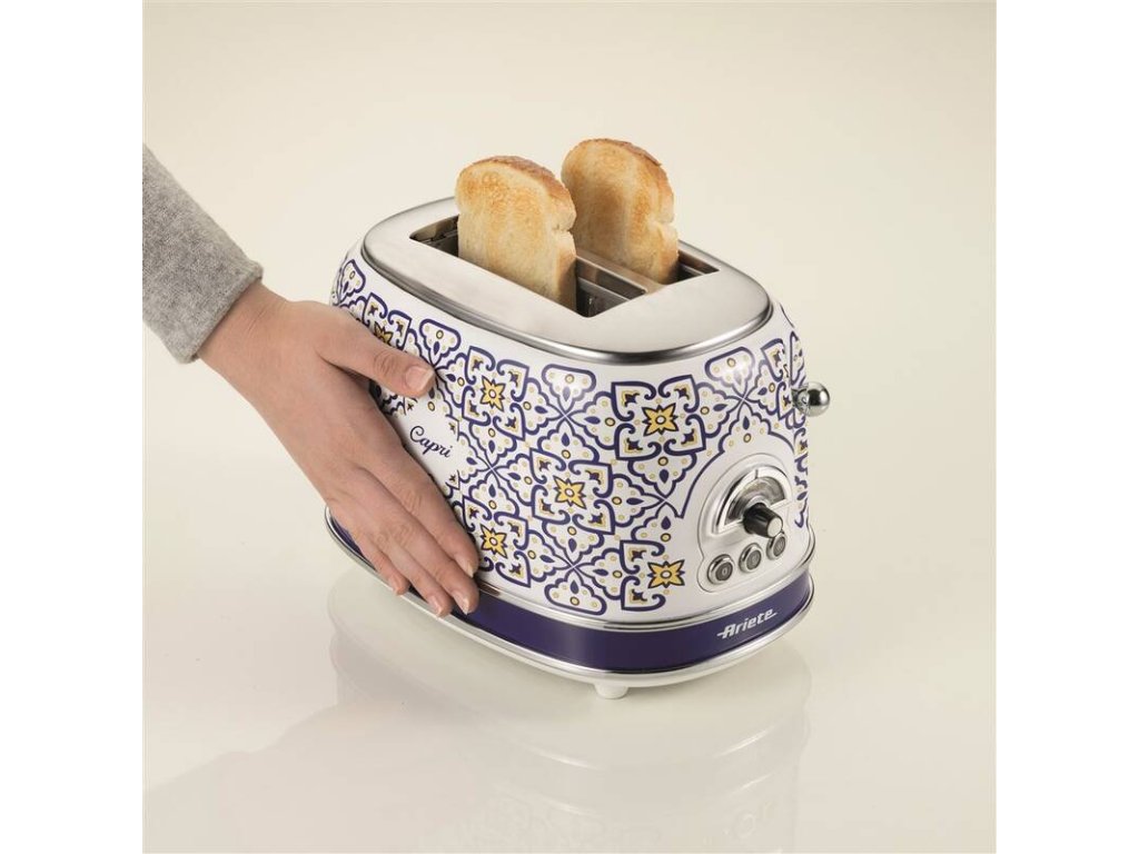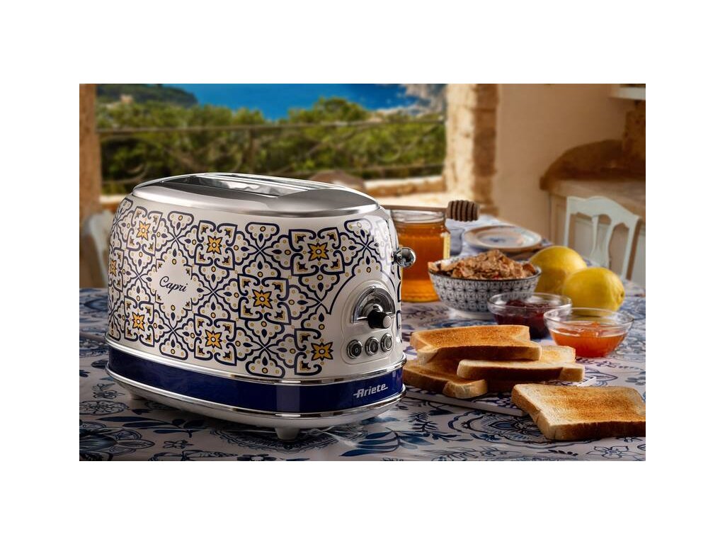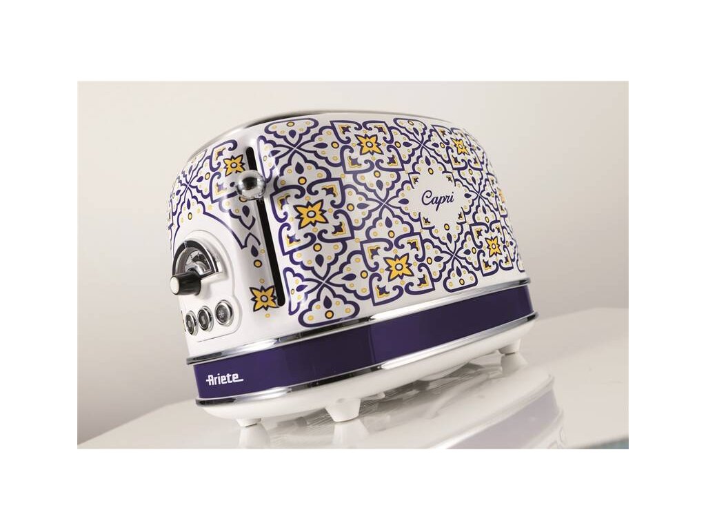 Hriankovač Ariete ART 155/CA Capri s ručne maľovaným vzorom v štýle tradičnej keramiky z ostrova Capri. Kapacita na dve hrianky, intuitívne ovládanie s otočným gombíkom a troma tlačidlami. Jednoduché čistenie s vyberateľnou miskou na omrvinky, funkcia opekania toastov a rozmrazovania. Chladné telo aj pri dlhej prevádzke, 6 stupňov ohrevu a rozmrazovania.