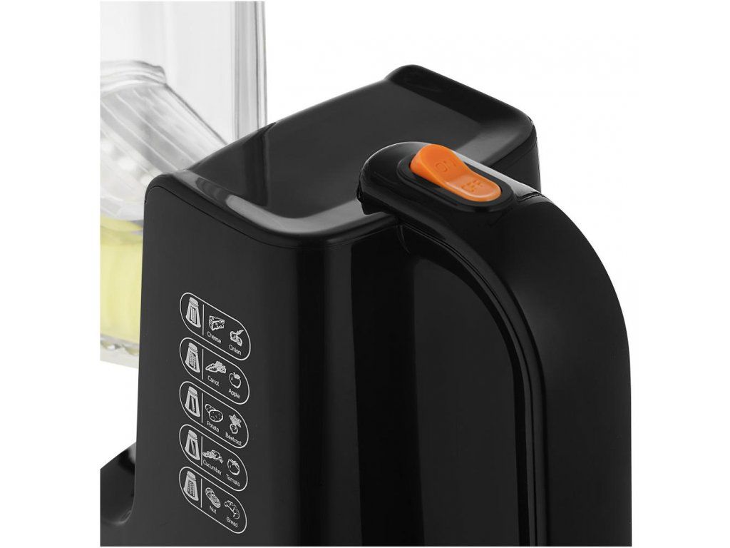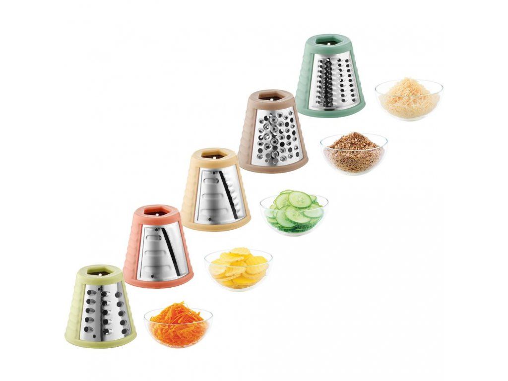 Príslušenstvo: Krájač na tenké plátky (zemiaky na lupienky, ovocie a zelenina na zdobenie), strúhadlo na vlnité plátky (ovocie a zelenina na zdobenie), hrubé strúhadlo (zelenina do polievky a šalátov, príprava placiek), jemné strúhadlo (šaláty, nátierky), veľmi jemné strúhadlo (mletie kokosu, orechov, príprava strúhanky)