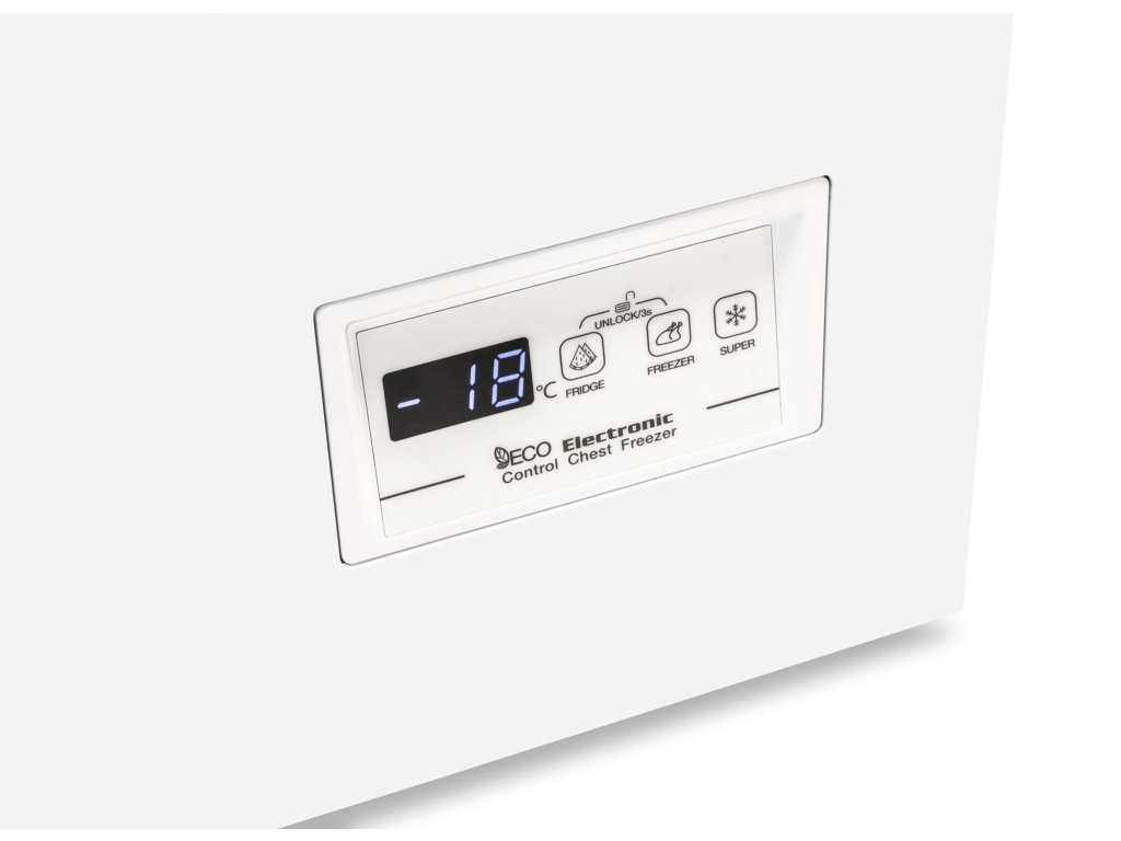 Truhlicová mraznička s teplotným rozsahom -15 ° C do -24 ° C Ročná spotreba energie: 182 kWh / rok Energetická trieda: E Úžitkový objem celkom: 142 l Hlučnosť: C 40 dB Klimatická trieda: SN-T ( 10 ° C do 43 ° C) Počet kompresorov: 1 Invertor BLDC kompresor Množstvo na zmrazenie za 24 hod: 7 kg Doba skladovania pri výpadku prúdu: 20 h Koše štandardne: 1