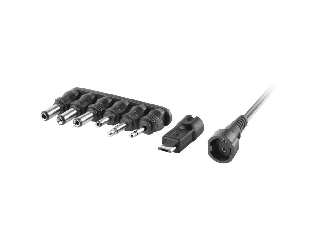 V balení 7 koncoviek: 2x jack (2,5 mm a 3,5 mm), 4x DC konektor (1,35 x 3,5 mm / 2,1 x 5,0 mm / 1,5 x 5,5 mm / 2,5 x 5,5 mm), 1x micro USB konektor