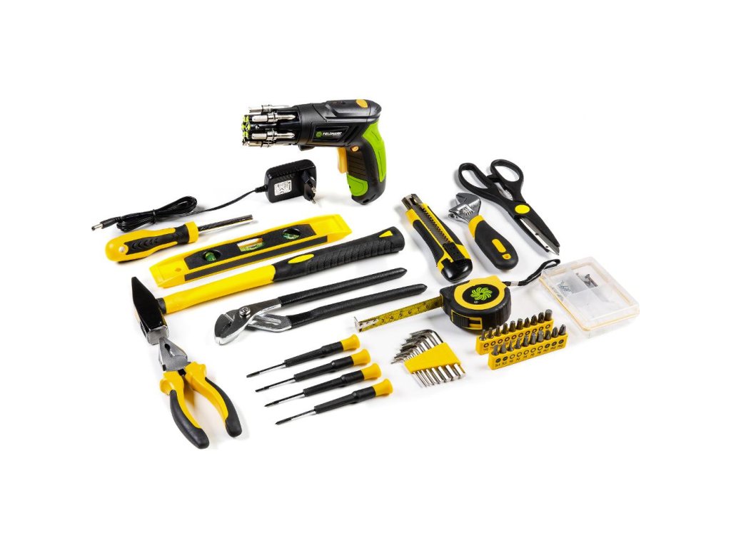 všestranným pomocníkom. Neoddeliteľnou súčasťou sady sú kombinované kliešte, vodováha, meter a kladivo.