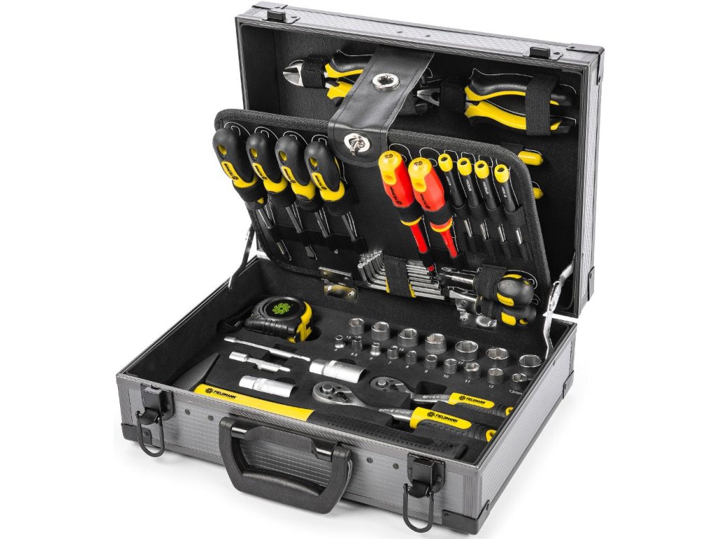 Hodinový manžel, domáci majster alebo profesionál – keď je potrebné niečo zmontovať, opraviť alebo utiahnuť, nie je čas na hrdinstvo ani kompromisy. Na scénu nastupuje praktická sada náradia Fieldmann FDG 5021 v štýlovom metalickom kufríku. V štyroch vrstvách nájdete skutočne široký sortiment akéhokoľvek náradia. Či už sa jedná o imbusy, krížové skrutkovače, ploché alebo izolované, svoje miesto tam majú aj mini skrutkovače. Nechýba ani nastaviteľný kľúč, odlamovací nôž s náhradnými nožmi, niekoľko druhov klieští a vodováha. Samozrejmosťou sú potom nástrčné hlavice, predlžovacia tyč, nástavce na sviečky, račne, adaptér na bity, vrátane magnetického držiaka a naozaj veľké množstvo bitov. Celú škálu týchto praktických vecí uzatvára meter s dĺžkou 3 m a 300g kladivo. Všetko prehľadne a bezpečne uložené, každý kúsok má svoje miesto a nebude vás pri ceste za prácou rušiť nepríjemné ťukanie alebo búchanie uvoľneného náradia. Fieldmann, značka kvality za dostupnú cenu.