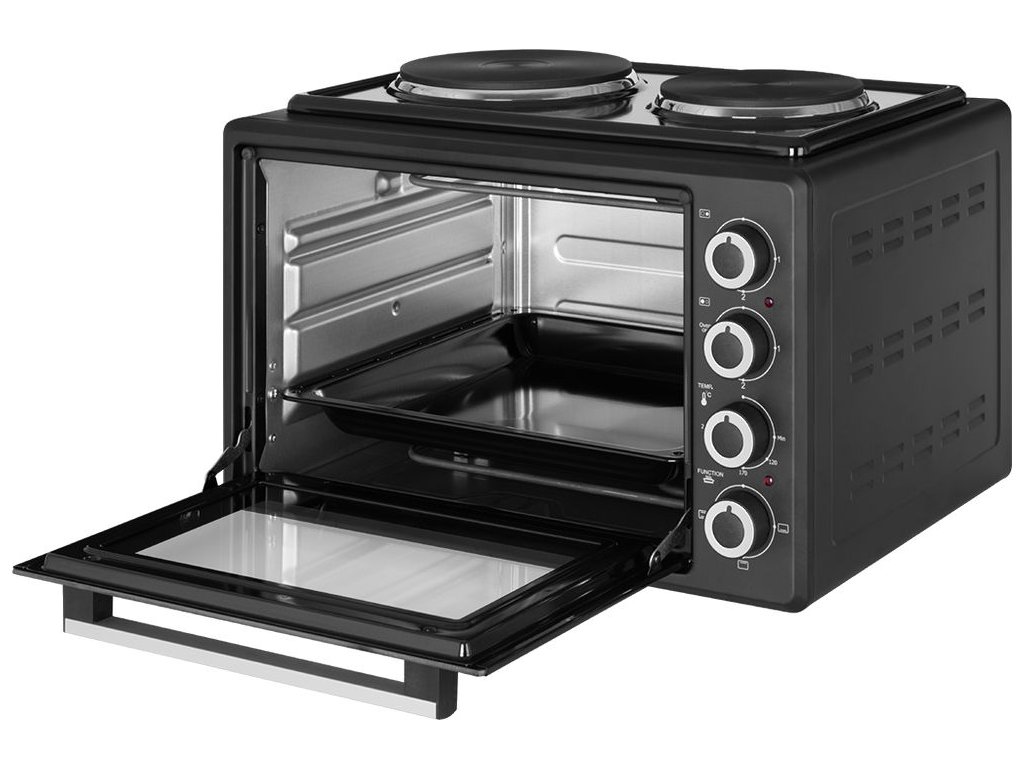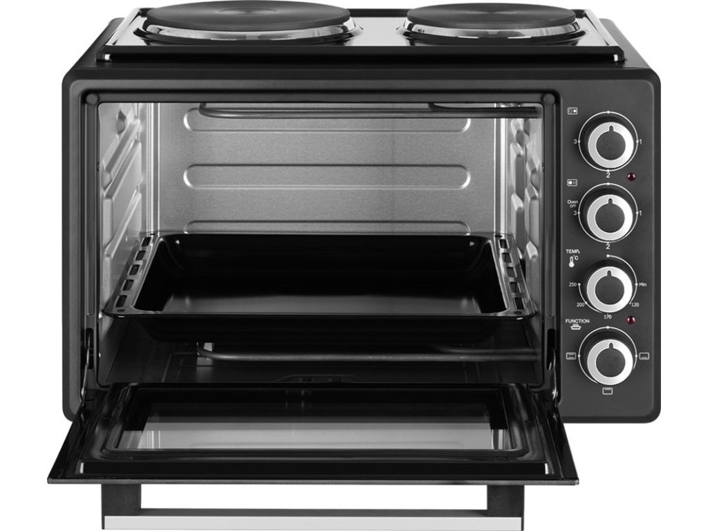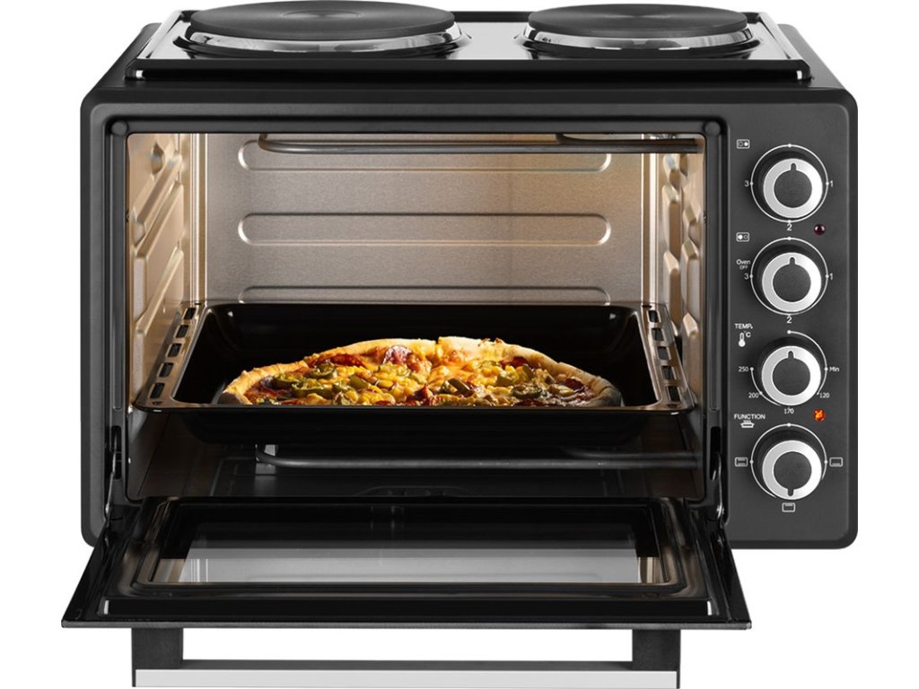 Pomocou tejto stolnej rúry môžete jednoducho chystať celý rad pokrmov. S obsluhou si hravo poradíte vďaka 4 jednoduchým ovládacím prvkom . Teplotu rúry môžete nastavovať v rozmedzí od 90 až do 250 ° C , čo je ideálna teplota pre domáce pečenie pizze. A určite oceníte aj možnosť používania funkcií, ako je malý gril, intenzívne pečenie a pečenie pri nízkych teplotách. Aby ste mohli rúru začať používať hneď po jej vybalení, dostanete k nej aj rošt, okrúhly (34,5 × 5cm) a hranatý plech (37×33,6×3,3cm). |