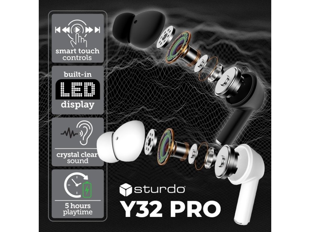 Bezdrôtové slúchadlá Sturdo Y32 Pro ponúkajú kvalitný zvuk, intuitívne dotykové ovládanie a moderný dizajn s praktickým LED displejom na nabíjacom puzdre. Vďaka hydroizolačnému TPU materiálu sú pohodlné a ideálne na každodenné používanie.