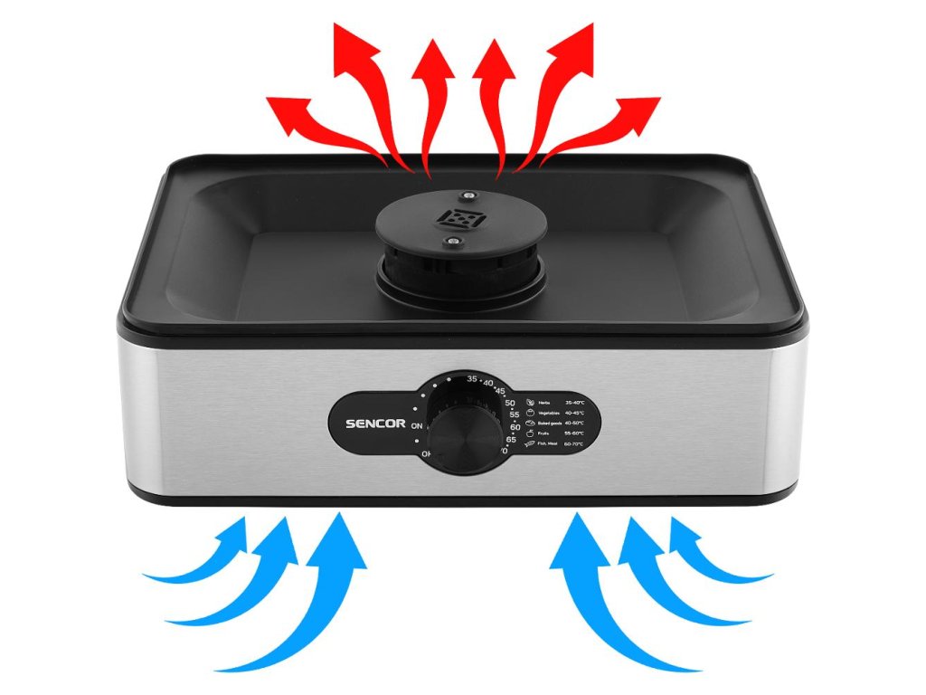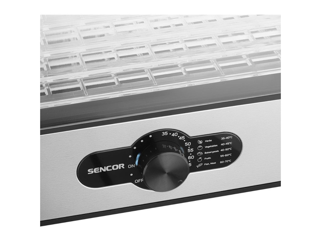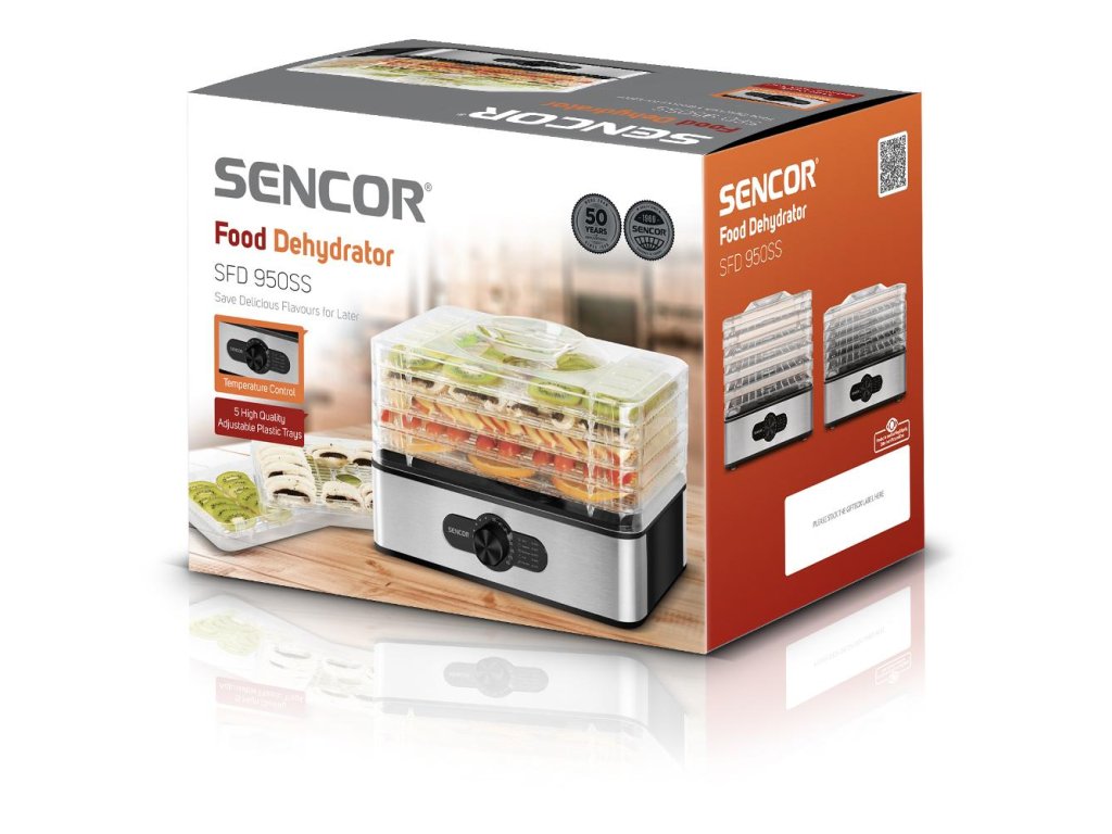 Zariadenie je vybavené výkonom 240 W a nastavením teploty od 35-70 °C(možnosť voľby po 5 °C), ktoré zaistí dokonalé usušenie všetkých vložených potravín. Integrovaný ventilátor sa postará o rovnomerné rozprestretie teploty na všetkých poschodiach. Prívodný kábel s dĺžkou 0,8 m umožňuje použitie kdekoľvek, kde sa dá sušičku pripojiť k elektrickému prúdu. Sencor SFD 950SS môžete používať úplne bez obáv, pretože je opatrený tepelnou poistkou proti prehriatiu a hlavným vypínačom so svetelnou signalizáciou prevádzky.