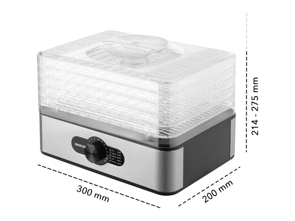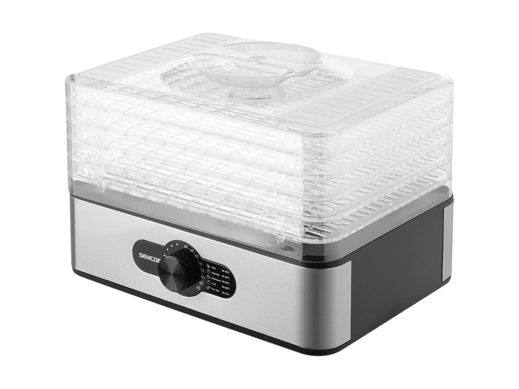 V základnej výbave je k dispozícii 5 sušiacich plastových sít s rozmerom 29 × 20 cm, pričom je možné zariadenie využívať aj iba s jedným z nich. Užitná výška poschodí nastaviteľná na 1,6 alebo 2,9 cm je doplnená dizajnom mriežok, ktorý zaisťujú prúdenie vzduchu a branie vzniku plesní . Nad sušenými potravinami môžete neustále udržiavať vizuálnu kontrolu, pretože je Sencor SFD 950SS vybavený priehľadným vekom. Plata z odolného plastu je možné ľahko umývať v umývačke alebo pod tečúcou vodou.