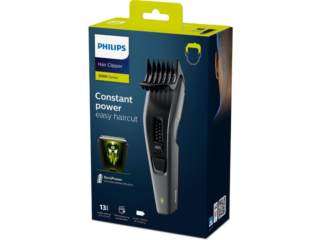 Vďaka strihaču vlasov Hairclipper 3000 vždy dosiahnete jednoduchý, rýchly a rovnomerný strih. Technológia DuraPower zabezpečí dlhotrvajúci výkon batérie, zatiaľ čo samoostriace kovové čepele budú bez mazania rovnako ostré ako v deň, keď ste si strihač kúpili